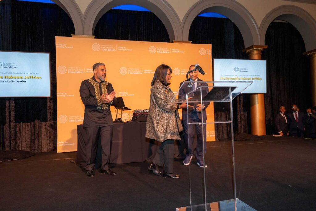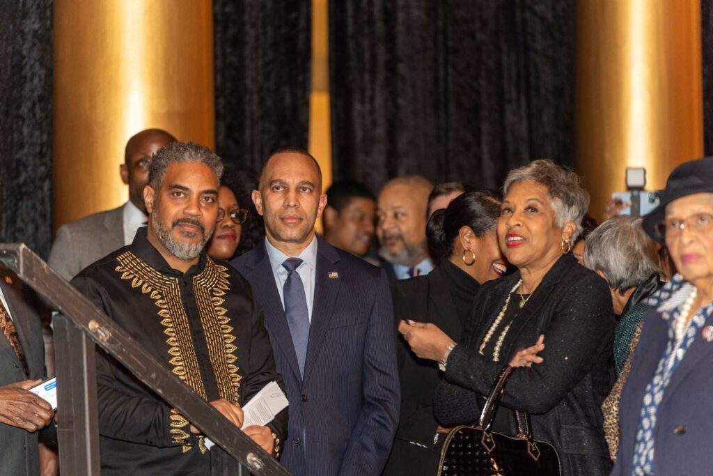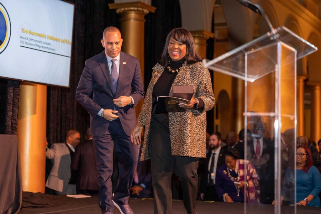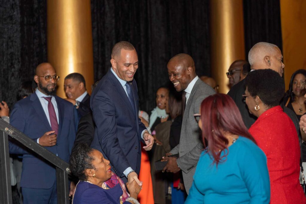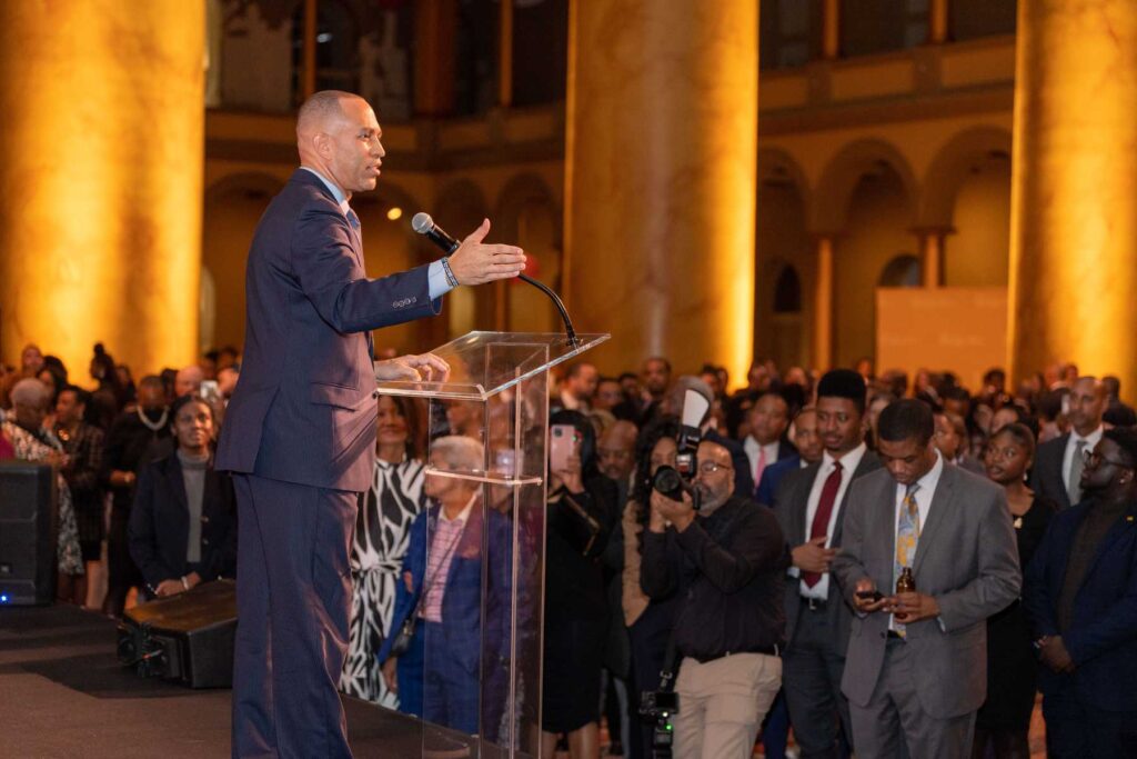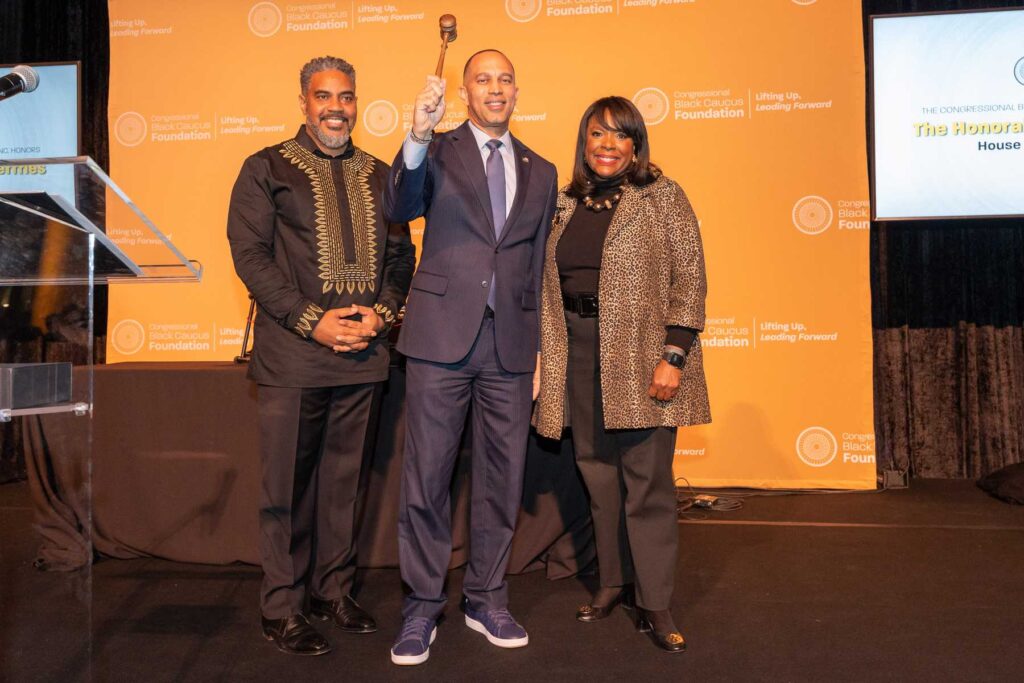 On February 28, 2023, the Congressional Black Caucus Foundation hosted a reception in honor of the historic election of The Honorable Hakeem Jeffries, as the new leader of the House Democratic Caucus and as the first Black lawmaker to lead a political party. The evening was highlighted with remarks from fellow Congressional Black Caucus members including Representative Terri A. Sewell, Board Chair, Congressional Black Caucus Foundation; Representative Steven Horsford, Chair, Congressional Black Caucus; and Representative Gregory Meeks.