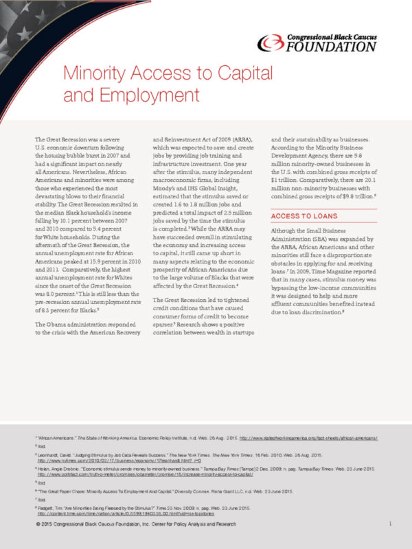 Data, analysis, and recommendations for improving Minority access to capital and gainful employment, prepared by the CBCF Center for Policy and Research.